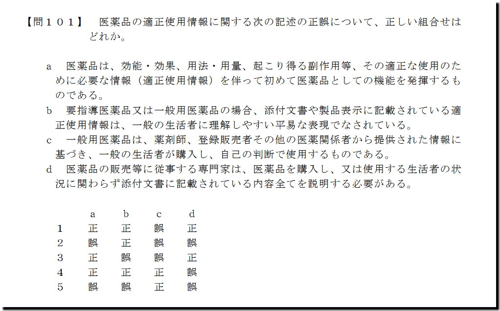 本問は、「適正使用」の「適正使用情報」についての問題です。難しいところはありません。テキストや過去問で、基礎・基本事項を押えて臨んでください。