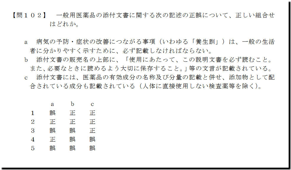 本問は、「適正使用」の「一般用医薬品の添付文書」の問題です。基礎・基本的なものばかりなので、難しいところはありません。テキストと過去問を繰り返しておけば、まず、取れます。