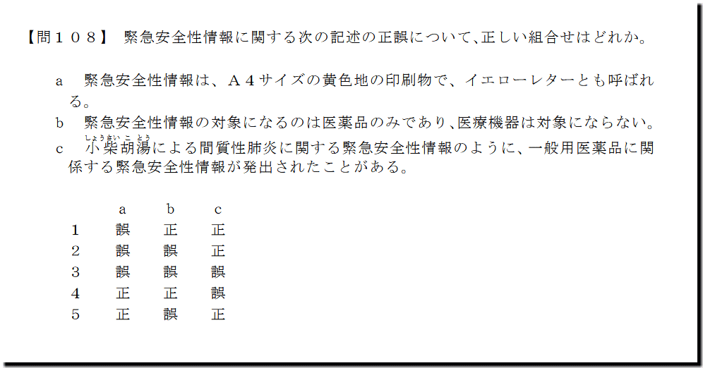 本問は、「適正使用」の「緊急安全性情報」についての問題です。基礎・基本的なものばかりなので、難しいところはありません。「医薬品」で勉強したことを思い出しながら、解答してください。