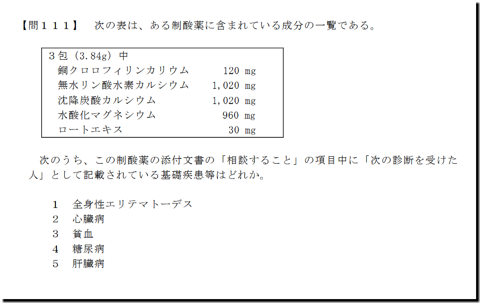 本問は、「適正使用」の「相談すること‐基礎疾患」の問題です。「相談すること」の問題です。時間に余裕のない人は、「捨て問」でいいです。