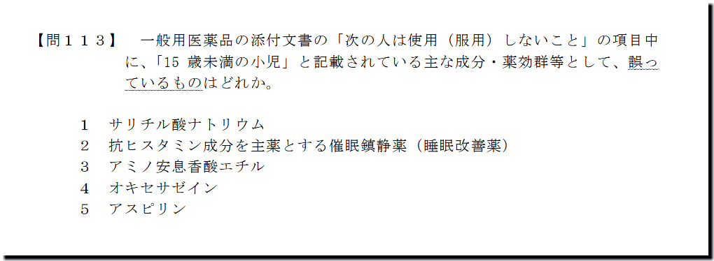 本問は、「適正使用」の「使用しない‐15歳未満の小児」についての問題です。基礎・基本的なものばかりなので、難しいところはありません。テキストと過去問を繰り返しておけば、まず、取れます。