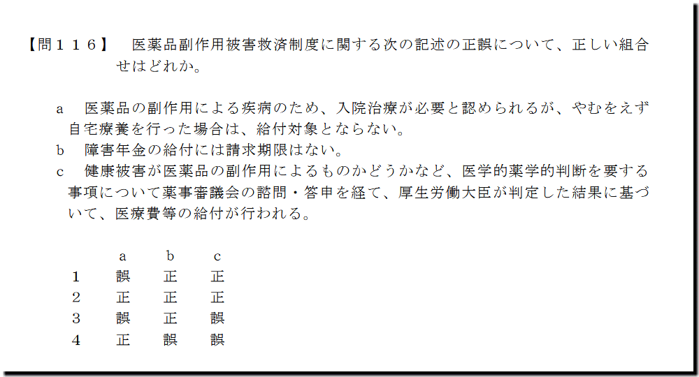 本問は、「適正使用」の「救済制度」についての問題です。基礎・基本的なものばかりなので、難しいところはありません。テキストと過去問を繰り返しておけば、まず、取れます。