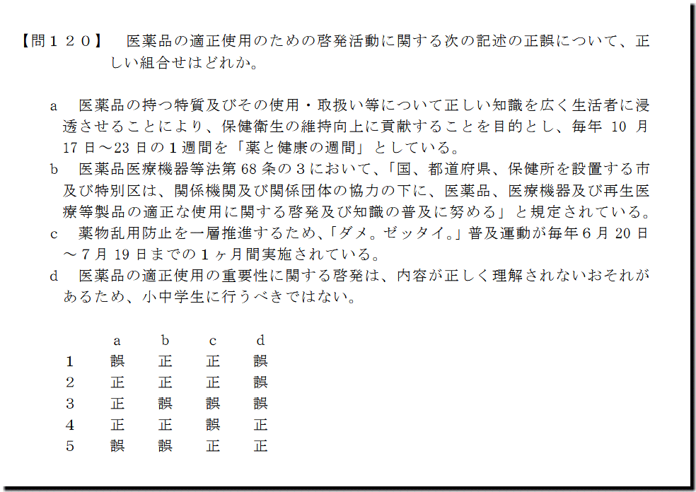 本問は、「適正使用」の「啓発活動」についての問題です。基礎・基本的なものばかりなので、難しいところはありません。テキストと過去問を繰り返しておけば、まず、取れます。