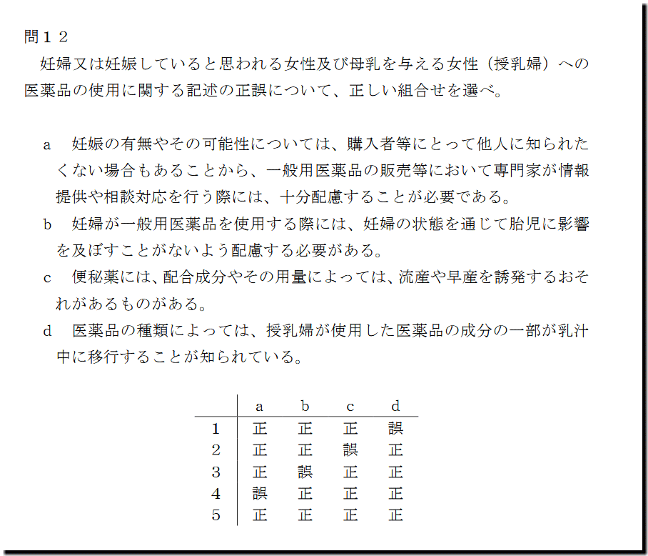本問は、「基本知識」の「妊婦等」の問題です。基礎・基本的なものばかりなので、難しいところはありません。テキストと過去問を繰り返しておけば、まず、取れます。