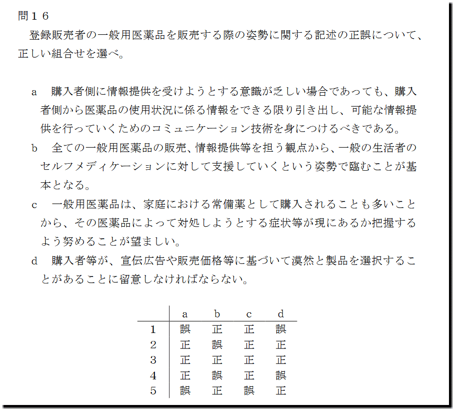 本問は、「基本知識」の「登録販売者の販売姿勢」についての出題です。基礎・基本的なものばかりなので、難しいところはありません。テキストと過去問を繰り返しておけば、まず、取れます。