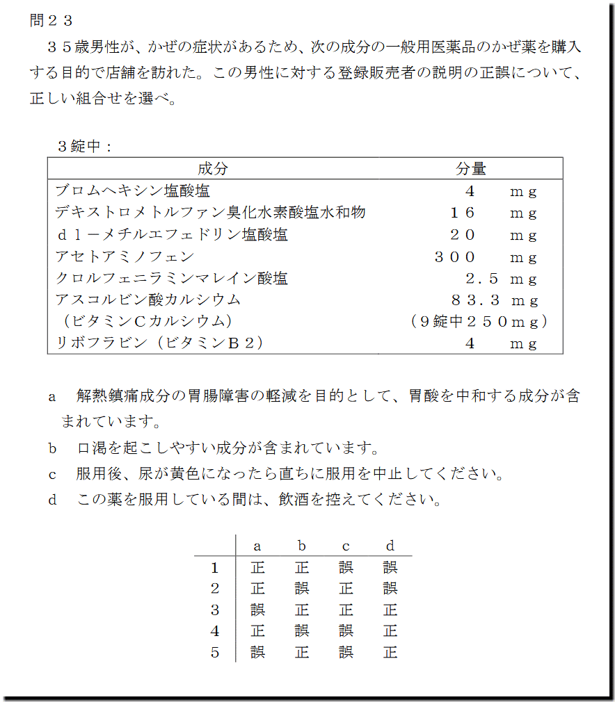 本問は、「医薬品」の「かぜ薬の成分」についての出題です。すべてよく問われる定番の論点なので、全選択肢が解けるようになっておきましょう。