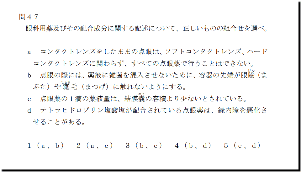 本問は、「医薬品」の「眼科用薬」についての問題です。基礎・基本的なものばかりなので、難しいところはありません。テキストと過去問を繰り返しておけば、まず、取れます。