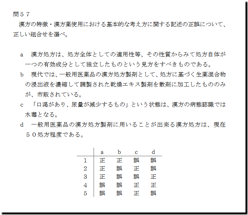 選択肢aの「漢方処方は、処方全体としての適用性等、その性質からみて処方自体が 一つの有効成分として独立したものという見方をすべきものである。」ですが、正しい記述です。