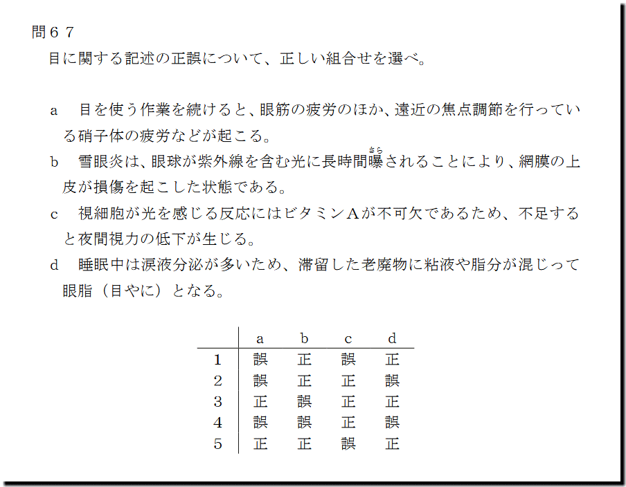 本問は、「人体」の「目」についての問題です。基礎・基本的なものばかりなので、難しいところはありません。テキストと過去問を繰り返しておけば、まず、取れます。