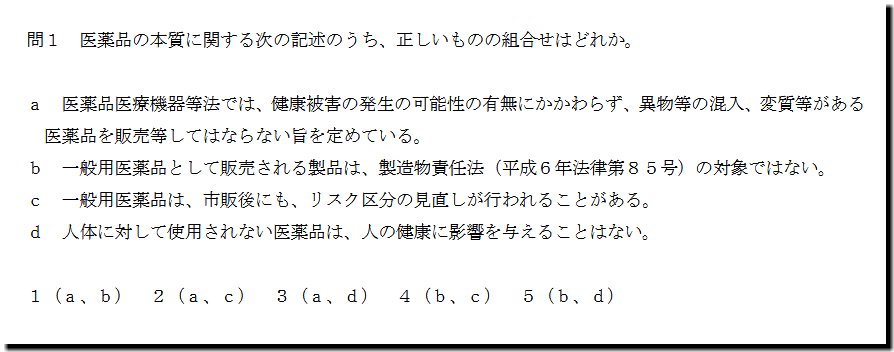 第1問は、「基本知識」の「医薬品の本質」の問題です。基礎・基本的なものばかりなので、難しいところはありません。テキストと過去問を繰り返しておけば、まず、取れます。