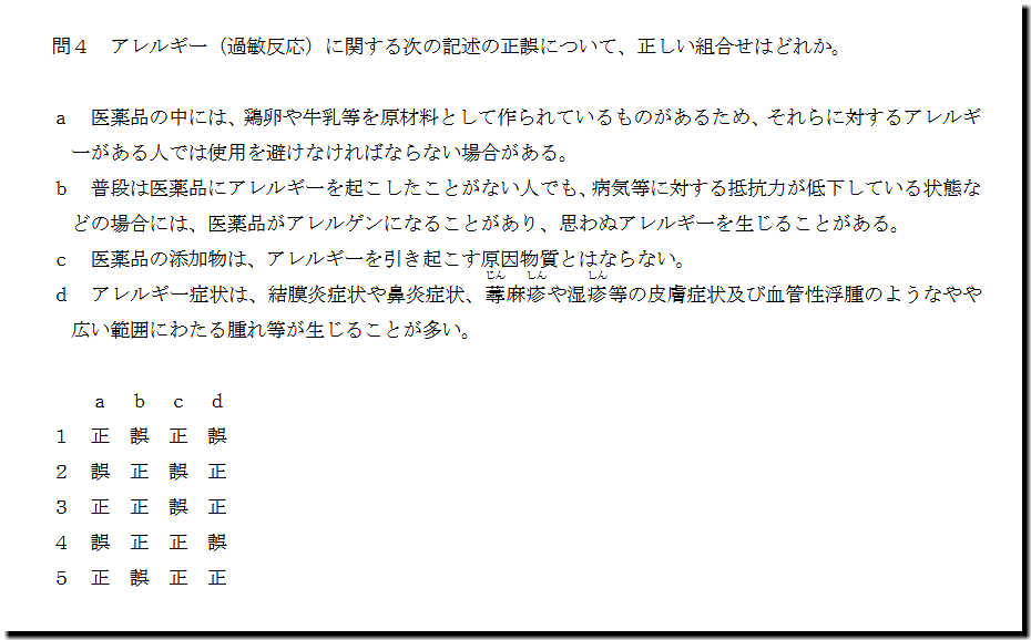 本問は、「基本知識」の「アレルギー(過敏反応)」の問題です。基礎・基本的なものばかりなので、難しいところはありません。テキストと過去問を繰り返しておけば、まず、取れます。