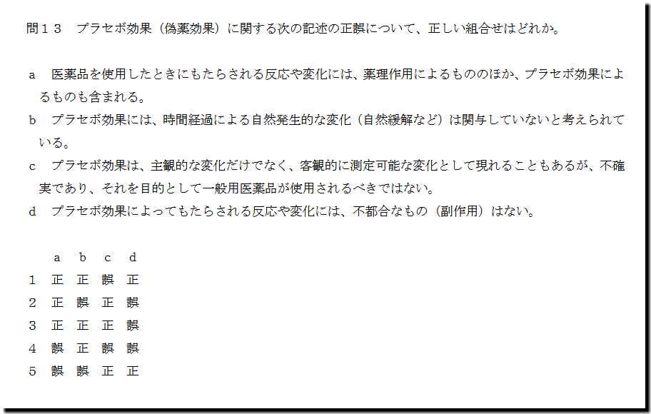 選択肢cの「プラセボ効果は、主観的な変化だけでなく、客観的に測定可能な変化として現れることもあるが、不確 実であり、それを目的として一般用医薬品が使用されるべきではない。」ですが、正しい記述です。
