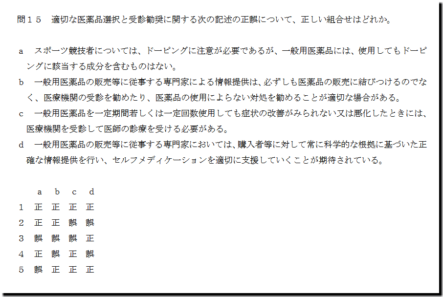本問は、「基本知識」の「適切な医薬品選択と受診勧奨」についての出題です。基礎・基本的なものばかりなので、難しいところはありません。テキストと過去問を繰り返しておけば、まず、取れます。