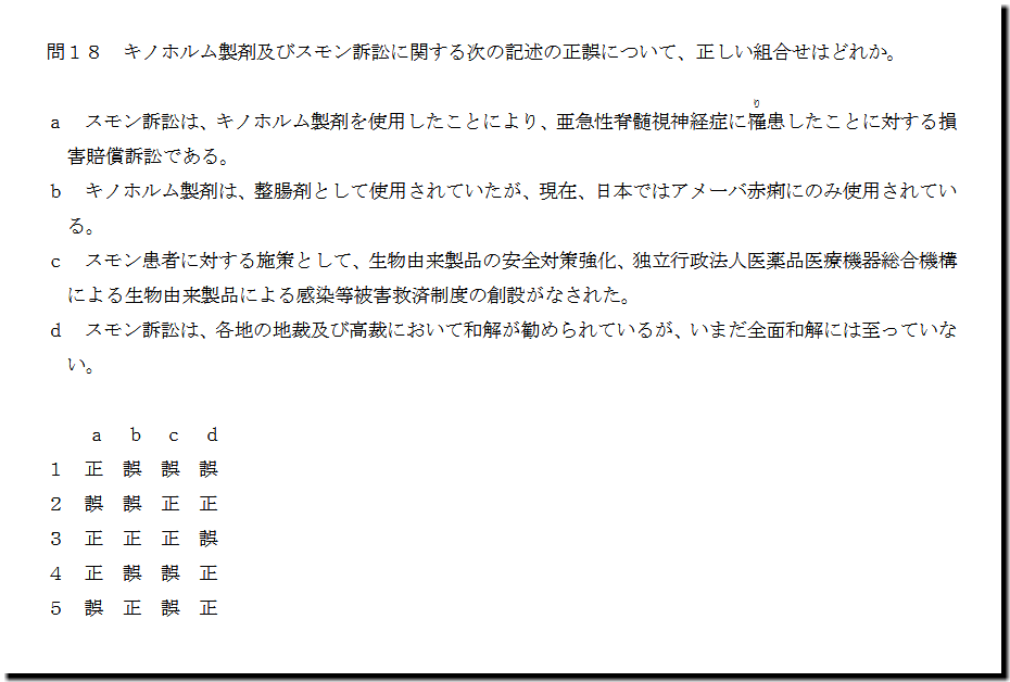 本問は、「基本知識」の「スモン訴訟」についての出題です。基礎知識では、ほぼ毎回出題される内容なので、テキストの精読は必須です。選択肢を1つとして、落とさないようにしましょう。