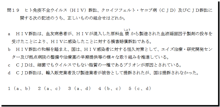 本問は、「基本知識」の「HIV訴訟・CJD訴訟」についての出題です。基本知識では、ほぼ毎回出題される内容なので、テキストの精読は必須です。選択肢を1つとして、落とさないようにしましょう。