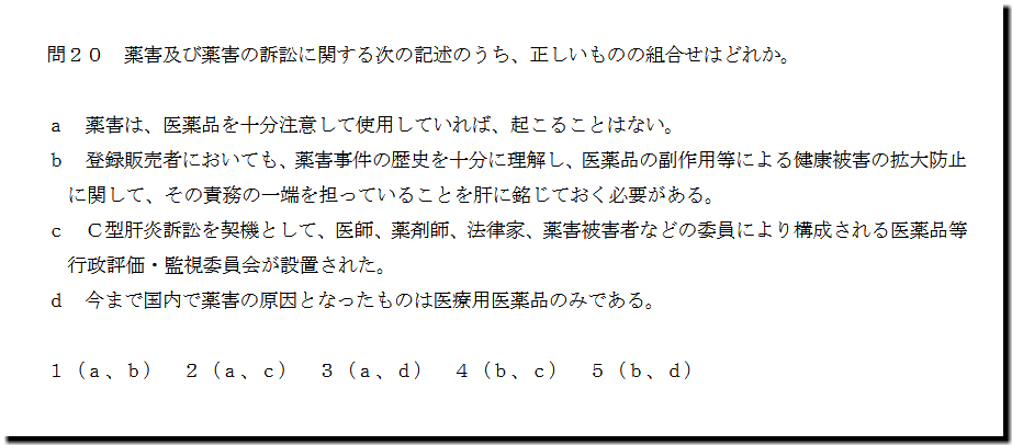 選択肢cの「C型肝炎訴訟を契機として、医師、薬剤師、法律家、薬害被害者などの委員により構成される医薬品等 行政評価・監視委員会が設置された。」ですが、正しい記述です。