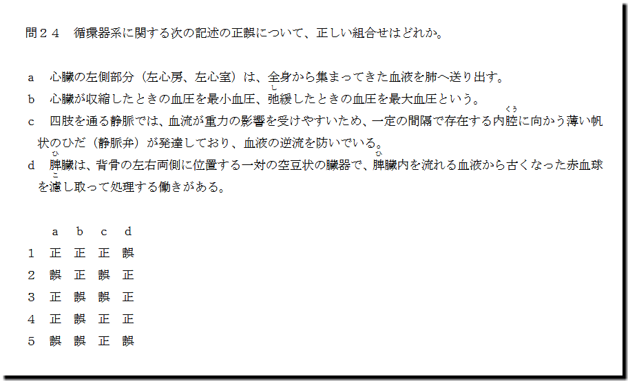 選択肢bの「心臓が収縮したときの血圧を最小血圧、弛 緩したときの血圧を最大血圧という。」ですが、誤った記述です。