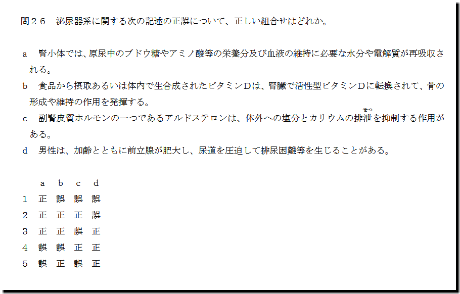 選択肢dの「男性は、加齢とともに前立腺が肥大し、尿道を圧迫して排尿困難等を生じることがある。」ですが、正しい記述です。