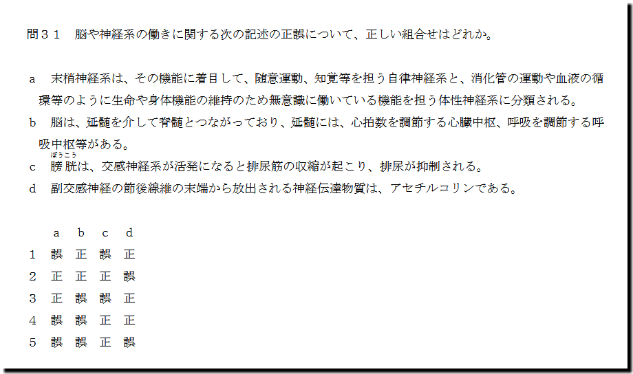 本問は、「脳や神経系の働き」についての問題です。基礎・基本的なものばかりなので、難しいところはありません。テキストと過去問を繰り返しておけば、まず、取れます。