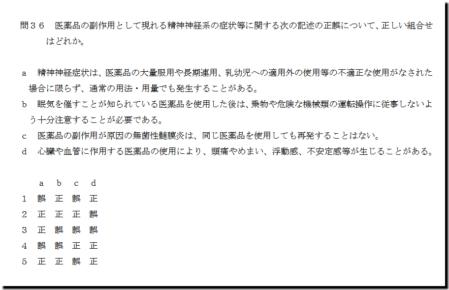 本問は、「人体」の「精神神経系の副作用」の問題です。基礎・基本的なものばかりなので、難しいところはありません。テキストと過去問を繰り返しておけば、まず、取れます。