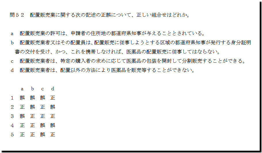 本問は、「法規」の「配置販売業」についての問題です。選択肢の1つが難しいだけで、他は普通に解ける問題です。難しい選択肢は、解けなくても最終解答を導けます。ただ、過去問に出たことは、甘く見てはいけないので、復習だけはしておきましょう。