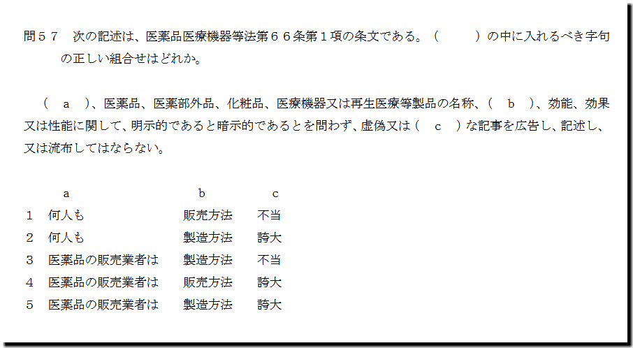 なお、本問の解答は、こちら(数字のみ)です。 ( a )、医薬品、医薬部外品、化粧品、医療機器又は再生医療等製品の名称、( b )、効能、効果 又は性能に関して、明示的であると暗示的であるとを問わず、虚偽又は( c )な記事を広告し、記述し、 又は流布してはならない。 a b c 1 何人も 販売方法 不当 2 何人も 製造方法 誇大 3 医薬品の販売業者は 製造方法 不当 4 医薬品の販売業者は 販売方法 誇大 5 医薬品の販売業者は 製造方法 誇大 2