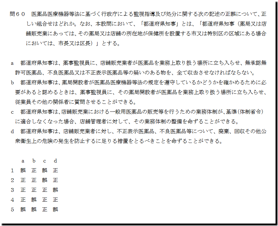 選択肢bの「都道府県知事は、薬局開設者が医薬品医療機器等法の規定を遵守しているかどうかを確かめるために必 要があると認めるときは、薬事監視員に、その薬局開設者が医薬品を業務上取り扱う場所に立ち入らせ、 従業員その他の関係者に質問させることができる。」ですが、正しい記述です。