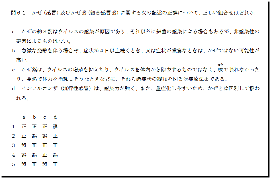 本問は、「医薬品」の「かぜ(感冒)」についての問題です。すべて基礎・基本事項です。テキストをきっちり読み込んでおきます。
