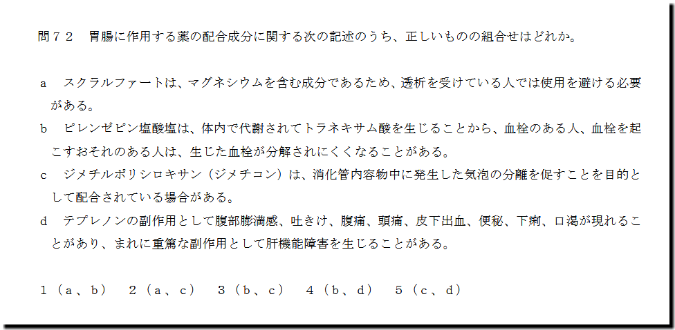 選択肢bの「ピレンゼピン塩酸塩は、体内で代謝されてトラネキサム酸を生じることから、血栓のある人、血栓を起 こすおそれのある人は、生じた血栓が分解されにくくなることがある」ですが、誤った記述です。