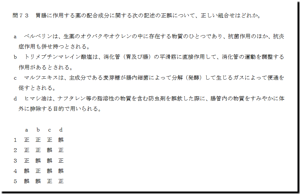 本問は、「医薬品」の「胃腸に作用する薬の配合成分」についての問題です。 選択肢に生薬の選択肢が1つありますが、最終解答は、その選択肢が出来なくても、導けるようになっています。他の選択肢は、基礎的なものなので、大丈夫かと思います。