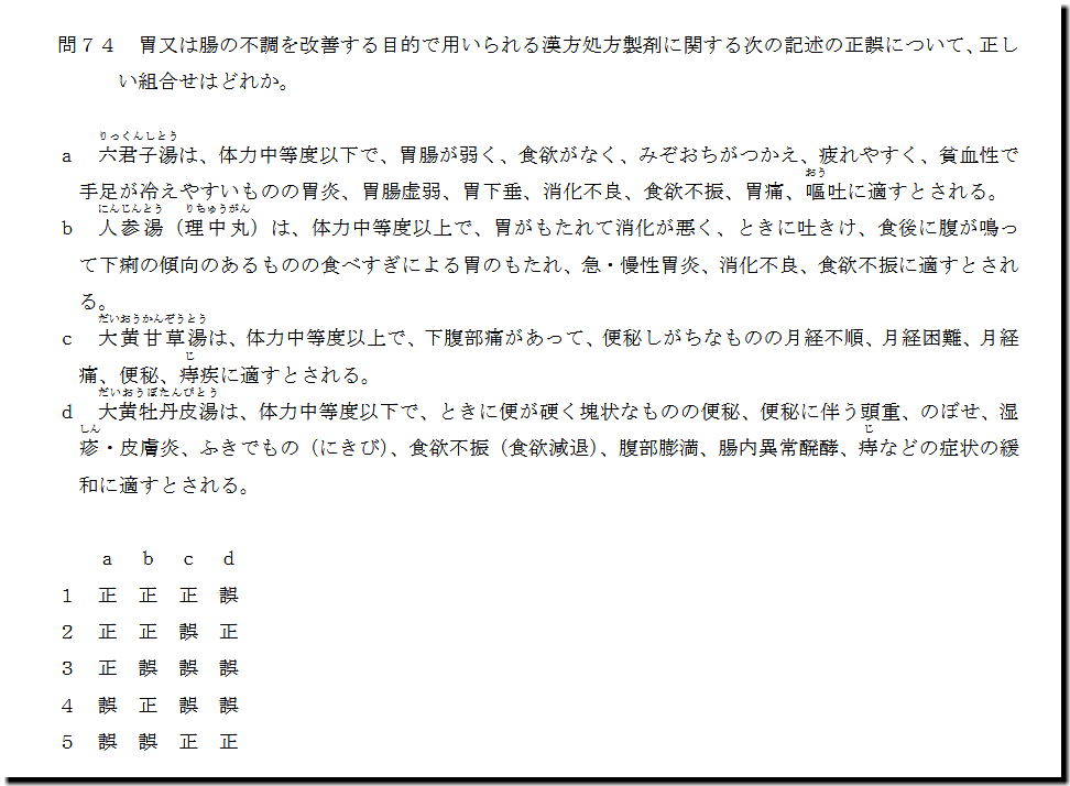 選択肢cの「大黄甘草湯 は、体力中等度以上で、下腹部痛があって、便秘しがちなものの月経不順、月経困難、月経 痛、便秘、痔 疾に適すとされる。」ですが、誤った記述です。