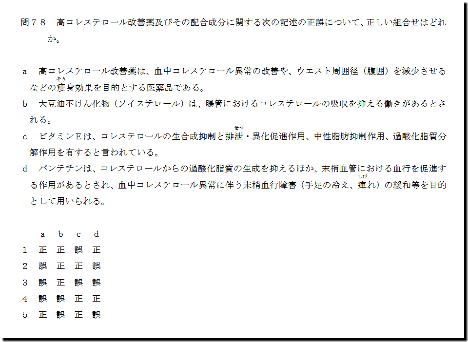 本問は、「医薬品」の「高コレステロール改善薬」についての問題です。基礎・基本的なものばかりなので、難しいところはありません。テキストと過去問を繰り返しておけば、まず、取れます。