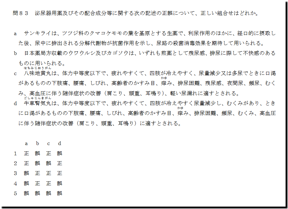本問は、「医薬品」の「泌尿器用薬」の問題です。生薬と漢方処方製剤で問題が構成されています。難しいです。落としても仕方がないでしょう。過去問に出たことは、甘く見てはいけないので、復習しておきましょう。