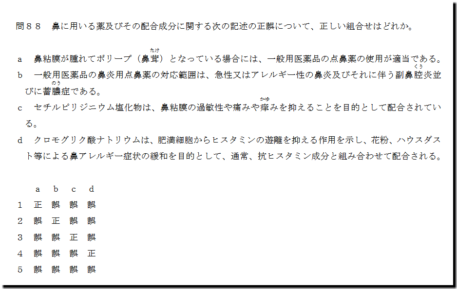 本問は、「医薬品」の「鼻に用いる薬」についての問題です。難しいところはありません。基礎・基本事項の出題です。