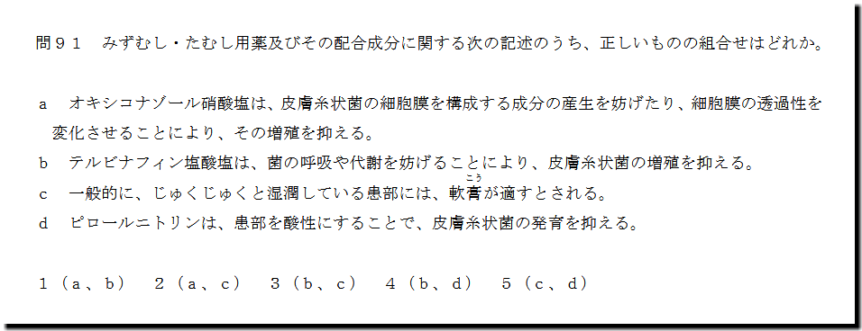選択肢bの「テルビナフィン塩酸塩は、菌の呼吸や代謝を妨げることにより、皮膚糸状菌の増殖を抑える。」ですが、誤った記述です。