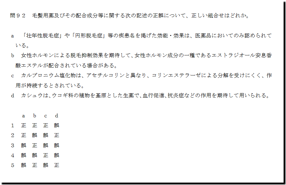 本問は、「医薬品」の「毛髪用薬」についての問題です。生薬の選択肢が1つありますが、他の選択肢で最終解答は導けます。毛髪用薬の生薬は頻出なので、ガチで押えておきましょう。