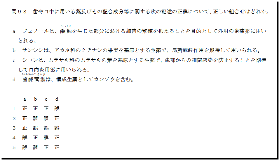本問は、「医薬品」の「歯や口中に用いる薬」についての問題です。生薬の選択肢が2つと、漢方処方製剤の選択肢が1つあります。勉強してないと解けないですね。過去問に出たことは、甘く見てはいけないので、復習しておきましょう。