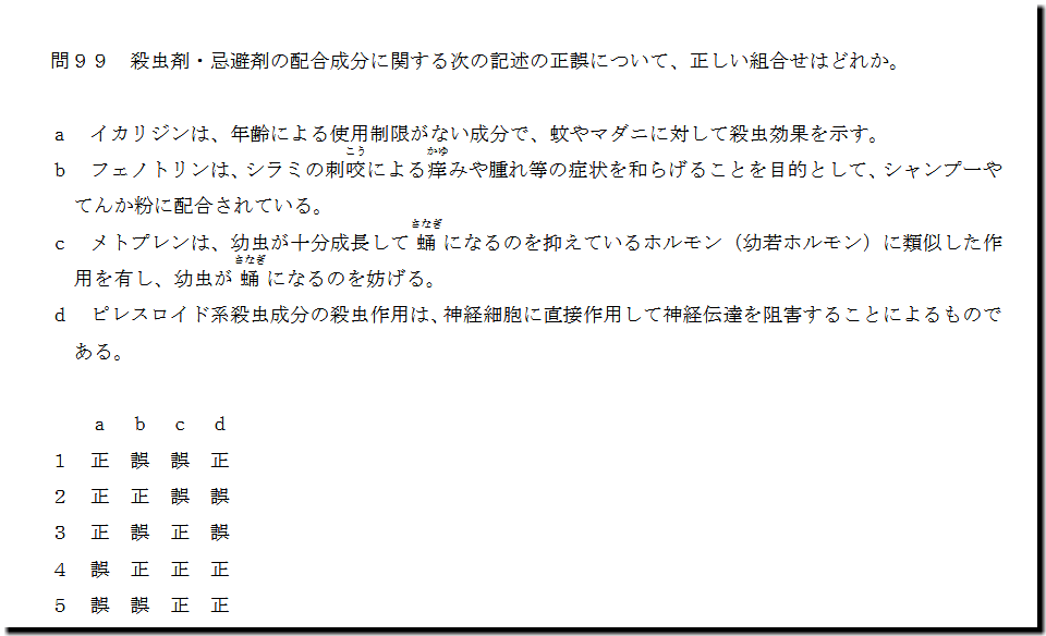 本問は、「医薬品」の「殺虫剤・忌避剤」についての問題です。難しいところはありません。テキストや過去問で、基礎・基本事項を押えて臨んでください。