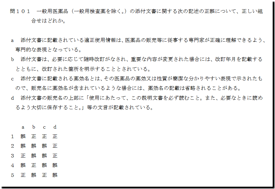本問は、「適正使用」の「添付文書」についての問題です。難しいところはありません。テキストや過去問で、基礎・基本事項を押えて臨んでください。