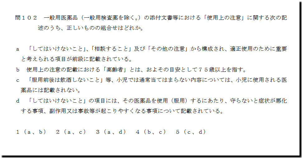 本問は、「適正使用」の「添付文書の使用上の注意」の問題です。 ガチの知識問題なので、知らないと無理です。最近、よく出るようになったので、確実に押えておきましょう。