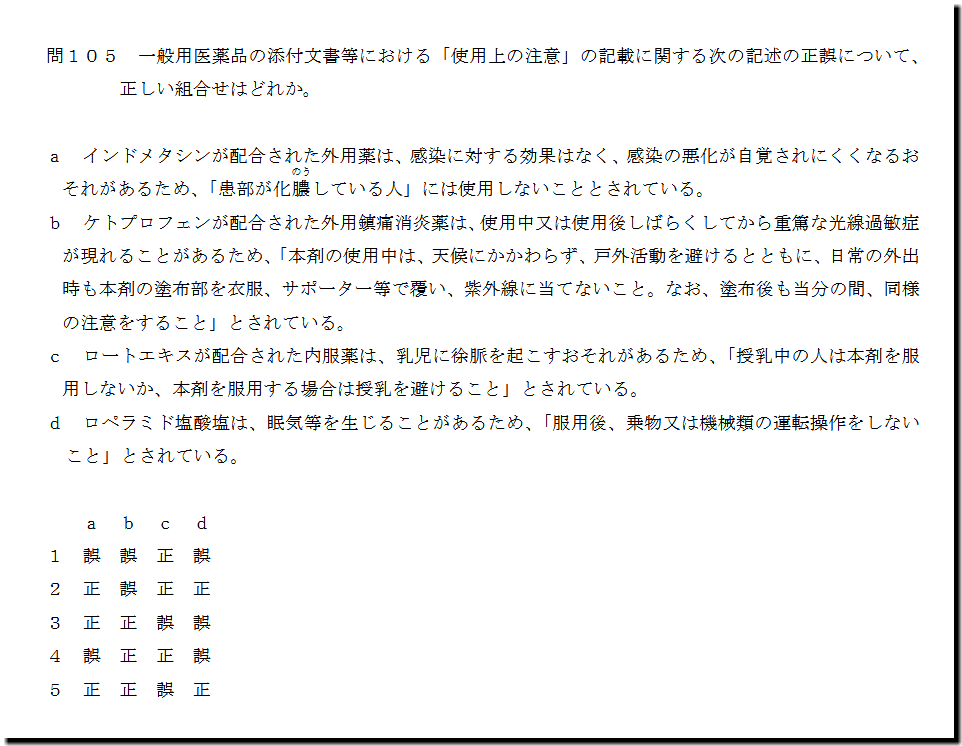 選択肢aの「インドメタシンが配合された外用薬は、感染に対する効果はなく、感染の悪化が自覚されにくくなるお それがあるため、「患部が化膿 している人」には使用しないこととされている。」ですが、正しい記述です。