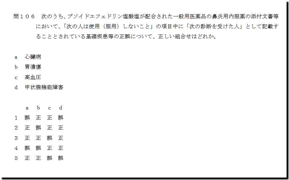 よって、答えは、「a 心臓病」と「c 高血圧」と「d 甲状腺機能障害」となります。 次のうち、プソイドエフェドリン塩酸塩が配合された一般用医薬品の鼻炎用内服薬の添付文書等 において、「次の人は使用(服用)しないこと」の項目中に「次の診断を受けた人」として記載す ることとされている基礎疾患等の正誤について、正しい組合せはどれか。