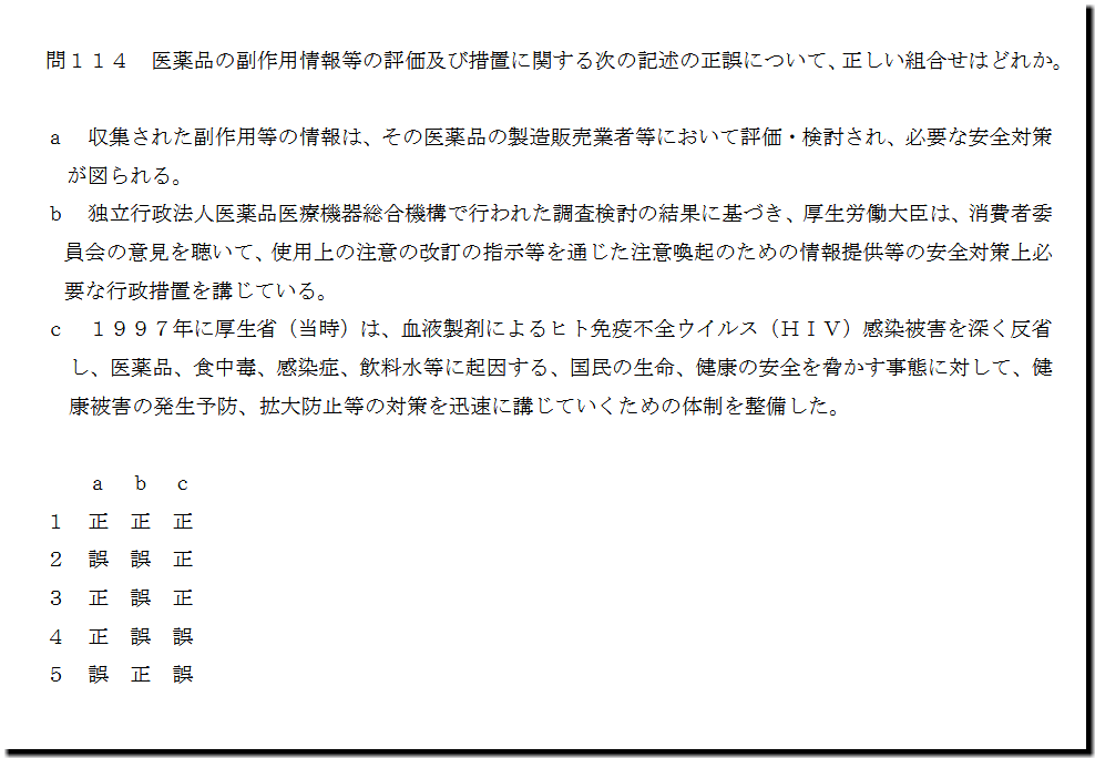 本問は、「適正使用」の「副作用情報等の評価及び措置」についての問題です。基礎・基本的なものばかりなので、難しいところはありません。テキストと過去問を繰り返しておけば、まず、取れます。