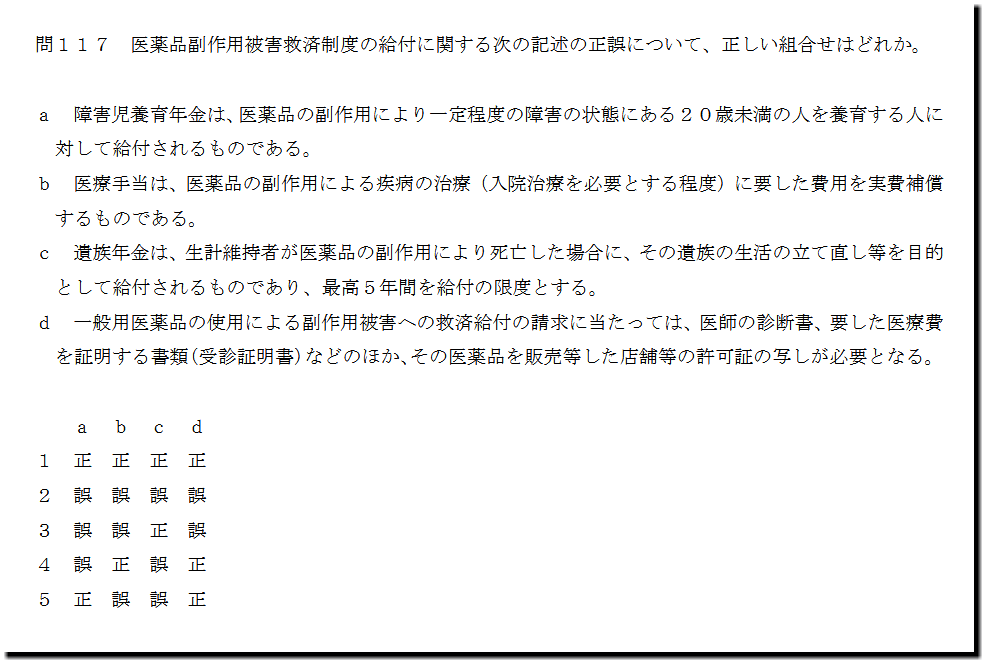 本問は、「適正使用」の「救済制度の給付」についての問題です。基礎・基本的なものばかりなので、難しいところはありません。テキストと過去問を繰り返しておけば、まず、取れます。