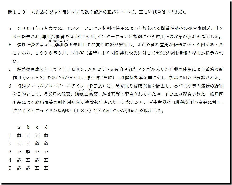 選択肢bの「慢性肝炎患者が大柴胡 湯 を使用して間質性肺炎が発症し、死亡を含む重篤な転帰に至った例があった ことから、1996年3月、厚生省(当時)より関係製薬企業に対して緊急安全性情報の配布が指示され た。」ですが、誤った記述です。