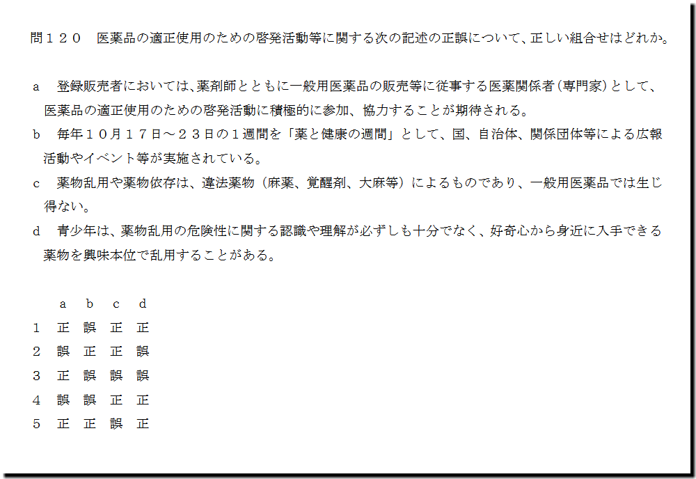 選択肢cの「薬物乱用や薬物依存は、違法薬物(麻薬、覚醒剤、大麻等)によるものであり、一般用医薬品では生じ 得ない。」ですが、正しい記述です。